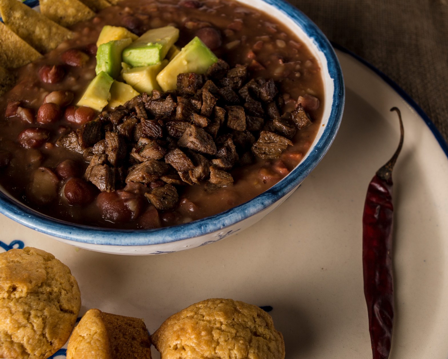San Lorenzo les ofrece un chili con carne mesuradamente picante, servido con carne preparada a la minuta (no incluida en la preparación de los frijoles), servido con aguacate, queso y pan de maíz, provocando una deliciosa mezcla de sabores que se apoyan y balancean en un gratificante gusto al comerlo.