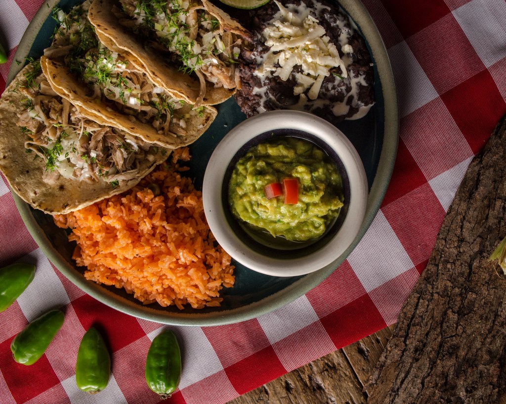 Carne de costilla de cerdo servida en tres tacos con cilantro y cebolla, acompañados de guacamole, frijol refrito y arroz mexicano.
