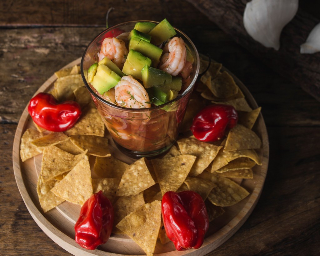 Camarones escalfados servidos con salsa de tomate, cebolla colorada, naranja, limón, cilantro, jitomate y aguacate. Acompañado de totopos.