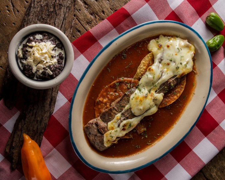Cama de tortilla de maíz, lomo de res sobre salsa chipotle y cilantro, cubierto con queso fundido al gratin y acompañado de frijol refrito.