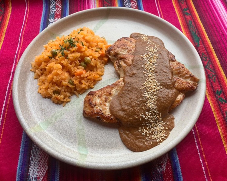 Pechuga de pollo preparada a la parrilla, cubierta de mole poblano (chocolate, chile y especies), y ajonjolí, servida con arroz mexicano y ensalada fresca.