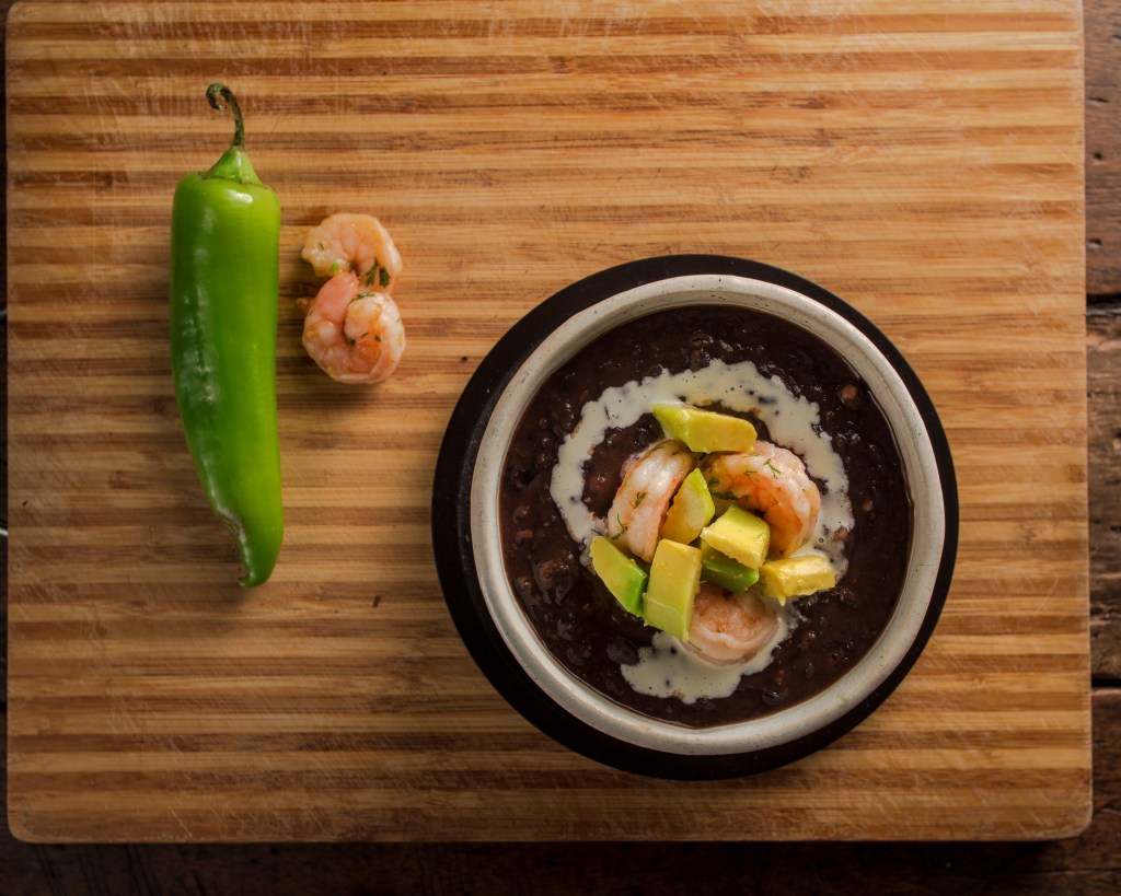 Frijol negro de la olla, camarón salteado, aguacate, crema de leche y cilantro.