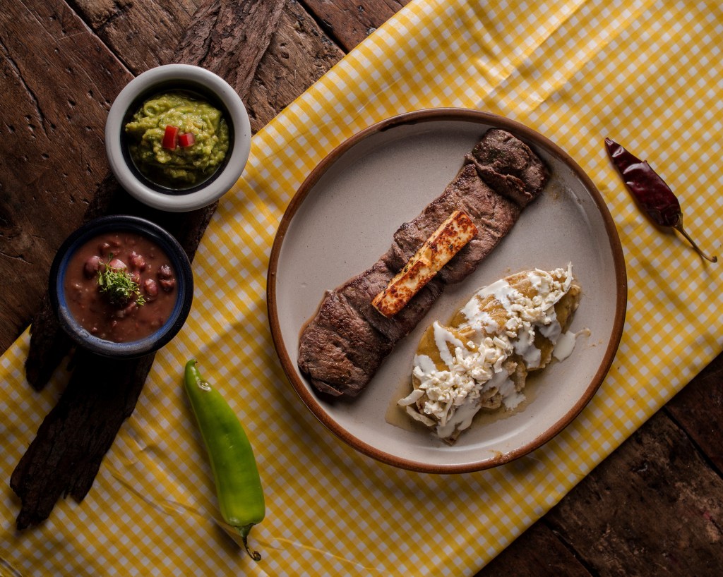 Lomo de res preparado a la plancha con limón, acompañado de enchiladas verdes, con toque de crema de leche y queso fresco, queso panela asado y frijoles charros.