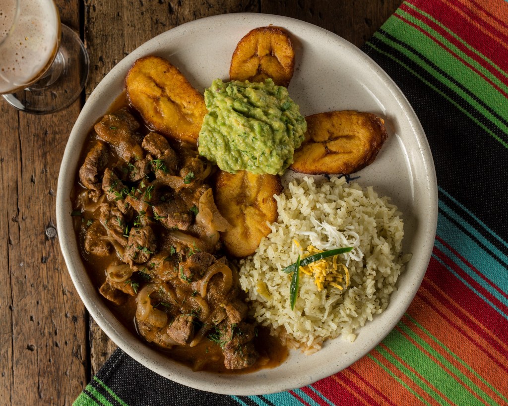 Rajas de lomo de res cubiertas de salsa de jitomate y cebolla rehogados, acompañadas de arroz verde y plátano macho maduro tajado y guacamole.
