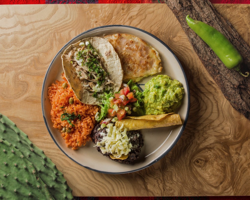 Plato combinado: taco de carnita de cerdo, mini flauta de pollo, quesadilla de jamón, guacamole, arroz mexicano, frijol refrito y pico de gallo