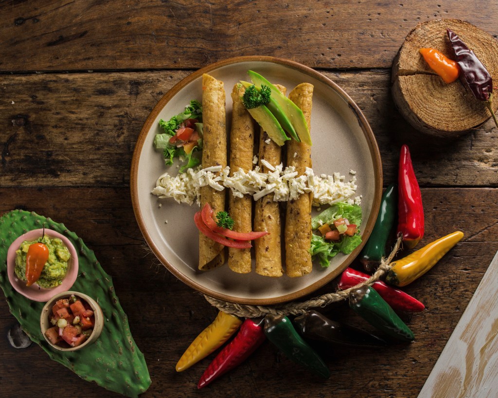 Cuatro tortillas de maíz fritas rellenas de pollo deshebrado con guacamole, jitomate y queso, servidas con pico de gallo.