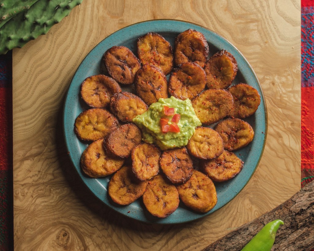 Plátano macho tajado, servido con guacamole y espolvoreado con canela y chile en polvo.