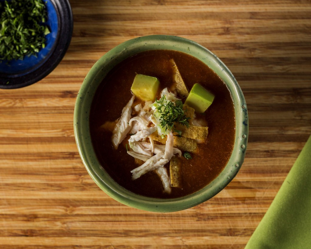 Tortilla de maíz frita, pollo deshebrado, aguacate, jitomate en puré, consomé de pollo, queso cebolla y cilantro.